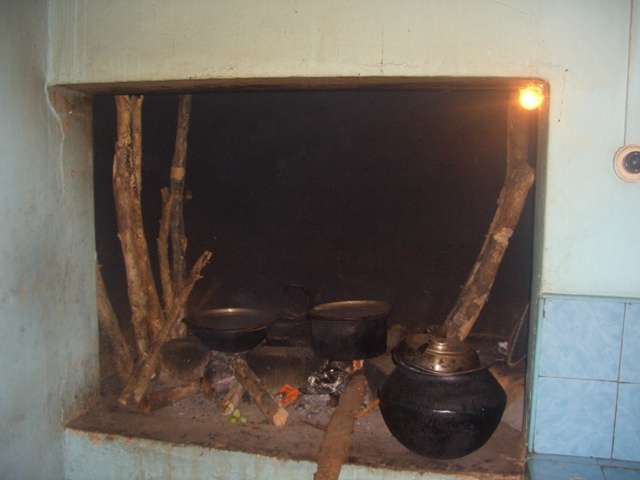 Auf dem Feuer steht ein schwarzer, etwas verbeulter Blechtopf und daneben ein großer Topf mit Wasser und Reis.