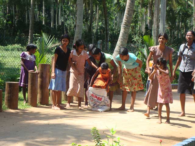Nach dem Mittagessen um 13.30 Uhr ging es dann endlich los! Wir haben laut Musik angemacht, ordentlich mit einer Glocke gebimmelt und alle zusammengeholt. Kinder und Personal. Die Teameinteilung hatte Julia schon am Vortag vorgenommen, so dass wir ein rotes und ein grünes Team hatten. Alle bekamen teamzugehörig mit Wasserfarben entweder grüne oder rote Farbe ins Gesicht gepinselt. Die Größeren selbstverständlich coole Streifen wie beim American Football. Meine Güte, war das ein Gewusel! Werde ich die Mädchen je „gebändigt“ bekommen? Sie dazu bringen, alle Spiele zu verstehen und mitzumachen? Meine Sorge war unberechtigt. Nachdem ich lautstark auf mich aufmerksam gemacht habe und die Glocke nochmal geläutet wurde, konnten Svenja und ich jeweils einem Team das Sackhüpfen erklären. Und schon ging es dann mit dem ersten Spiel des Tages los. Was für ein Spaß und ich war einfach nur froh und erleichtert, dass alle Freude hatten, mitfieberten und sich gegenseitig lautstark anfeuerten. So kam dann ein Spiel nach dem anderen dran.