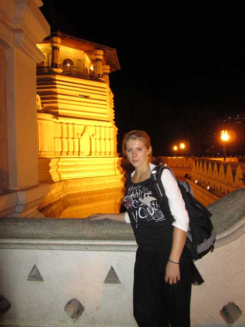Stunden erreichte ich Kandy. Erst sah ich mich ein wenig um und genoss den Anblick von Kandy Lake und suchte mir etwas Leckeres zu essen. Nachdem mir ein kleines singhalesisches Mädchen an einem Stand ein Armband schenkte, war es höchste Zeit in den Tempel zu gehen, da um 18:30 die tiefen Tore zum Eckzahn Buddhas geöffnet werden und eine Zeremonie startet. Das wollte ich natürlich nicht verpassen und beeilte mich. Die Frau am Eingang ließ mich nur leider nicht rein weil mein T-Shirt mit Ärmeln dennoch zu freizügig war. Ich hatte aber leider zufällig bei 35 Grad kein langärmliges dabei und beschloss deshalb mir einfach meine Leggings über die Arme zu ziehen. Was tut man nicht alles für Buddha, denn ich durfte dann hinein. Die Zeremonie war cool mit Trommeln und Flöten wurden die Tore geöffnet und für die Buddhisten war das ein großer Moment. Einige Mönche betraten den geheimen Raum und beteten.