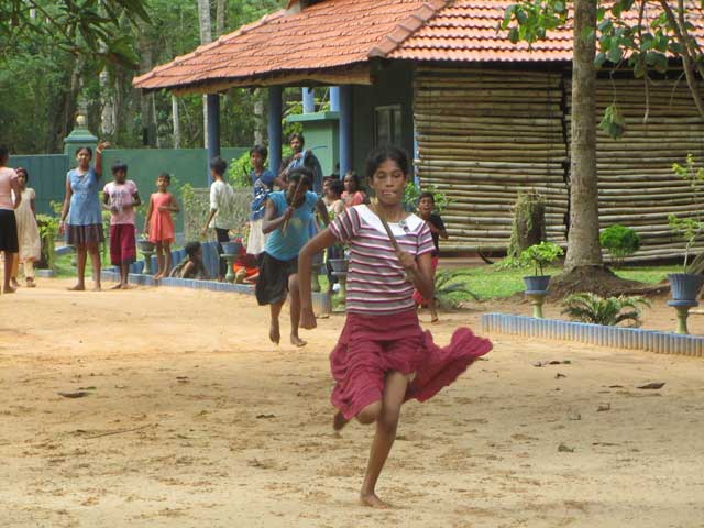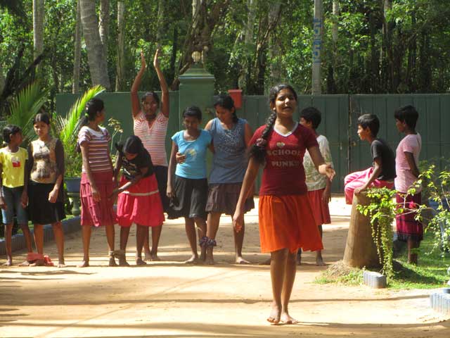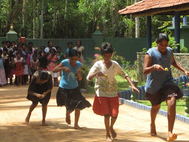 Am 3.9. habe ich mit den Mädels ein Spielefest veranstaltet. Große Planung war dazu nicht nötig, da die meisten Mädels schnell zu begeistern sind. Die Spiele waren schon länger geplant aber gestern hat es auch als kleiner Ferienabschluss gut gepasst. Alle Mädels haben sogar mitgemacht und das mit Ehrgeiz und Elan! Ich teilte die Mädchen in 4 möglichst gleichstarke Gruppen ein und wir trafen uns nach dem lunch alle am Gate. Als erstes gab es von mir eine Kampfbemalung. Ich hatte einen Tuschkasten mitgenommen und ordnete den verschiedenen Gruppen (Team Dilki, Team Rashani, Team Hasini und Team Dinesha) jeweils eine Farbe zu, die sie dann mit einem Streifen auf die Wange bekamen. Ich erklärte den Mädels, dass die jeweiligen Teamcaptains immer 1 oder mehrere Mädchen für das folgende Spiel auswählen sollen, damit auch die ganz kleinen mal drankommen. Der erste bekam auf meiner Punkteliste 3 Punkte, der Zweite 2, der Dritte 1 und der Letzte gar keinen.