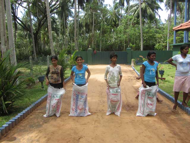 Das erste Spiel lautet ganz klassisch Sackhüpfen. Dazu habe ich mir vom Personal 4 leere Reissäcke geben lassen, die sahen recht stabil aus und in Sri Lanka ist Müll halt nicht gleich Müll J Wir starteten kurz hinter dem Gate und hatten eine Bahn von etwas 20m gezogen. Für dieses Spiel wurde jeweils 1 Mädchen aus jedem Team benötigt. Die ersten 4 traten an den Start und es wurde losgehüpft. Die restlichen Mädels schrien, klatschten und feuerten ihr Team so doll an wie es nur ging! Im Zielbereich wurde danach ordentlich gejubelt.