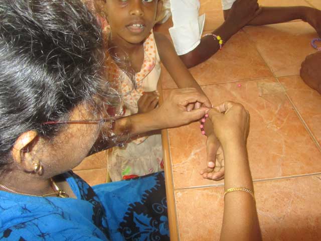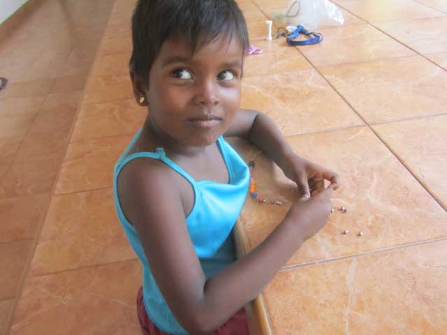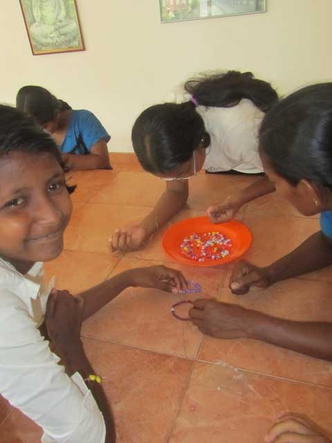 Diese Woche habe ich mit den Mädels Perlenarmbänder gemacht, die riesige Perlendose war danach leer… alle Mädels zeigten mir stolz ihre Kunstwerke aber nach 10 min flogen die Perlen auch schon quer über das Angels Home Gelände. Irgendwie ist das so ein Tick der Mädels wenn sie ein schönes Armband sehen, es entweder demjenigen gleich abzunehmen oder einfach mal dran zu reißen. Als ich hergekommen bin besaß ich auch noch so 1,2 kleine Armbänder mehr, die jetzt nicht mehr auffindbar sind. Aber das waren keine wertvollen Armbänder, daher macht es mir nichts. Auf jeden Fall hatten die Mädels super viel Spaß beim Perlenaufziehen, sogar das Personal (ja erwachsene Frauen) fingen an pinke und rosa Perlen aufzuziehen und die Initialen ihrer Männer einzubauen. Ich hätte mich wegschmeißen können vor Lachen. Aber die Singhalesen sind halt leicht zu begeistern und alles was bunt und für kleine Mädels ist gefällt hier auch den erwachsenen Frauen.