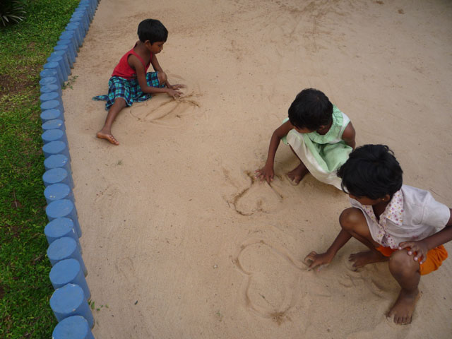 echsten Bild seht ihr, wie wir das englische Alphabet in Schrift lernen. Wir schreiben einzelne Letter in den Sand, was den Vorteil hat, dass die Kinder, wenn doch mal ein Buchstabe verkehrt ist, sie einfach ueber den Sand wischen und es noch ein Mal probieren koennen.