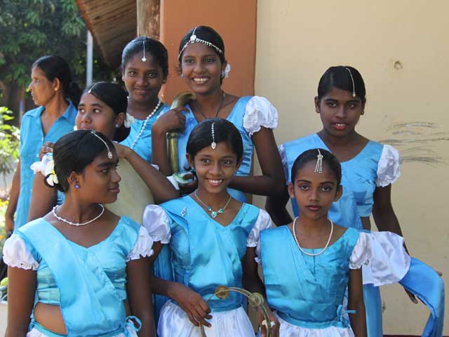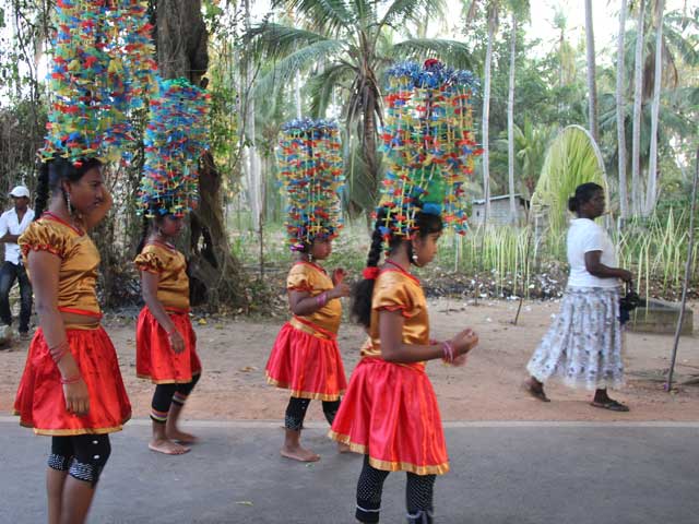 Letzte Woche fand in Marawila eine „Perahera“, ein buddhistisches Festival, statt. Der Buddhismus ist die in Sri Lanka meist verbreitete Religion bzw. Lebensanschauung. Bei dieser „Perahera“ handelte es sich um die „Devale Perahera“, die jedes Jahr um diese Zeit stattfindet. Sie wurde vom lokalen Tempel in Marawila organisiert, der nahe dem Angels Home gelegen ist. Nachdem zwei der Mädchen in traditioneller Kleidung, also Saris, an dem Umzug teilnahmen, war es Anlass genug für alle älteren Mädchen des Heims, sich Ihnen anzuschließen und den Umzug durch die Strassen Marawilas zu begleiten. Ich habe mir die Gelegenheit auch nicht entgehen lassen diesem Fest beizuwohnen und bin ebenfalls mitgekommnen. Treffpunkt war zunächst an der Schule. An der Schule angekommen, fiel mir direkt auf, dass der Schulhof mit Stacheldraht eingezäunt war – an einer ausgebeutelten Stelle musste ich nämlich durchsteigen, um auf das Gelände zu kommen. Ein merkwürdiger Anblick. Jedenfalls sind wir dort auf die Klassenkameradinnen gestoßen, die bereits hektisch damit beschäftigt waren, sich zu schminken, ihre blau-weißen Gewänder geradezurücken und die letzte Blüte im Haar zu befestigen. Die „Kostümierten“ wurden mit dem Bus abgeholt und an den Startpunkt des Umzugs gefahren.