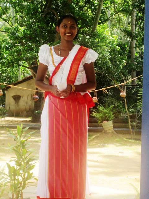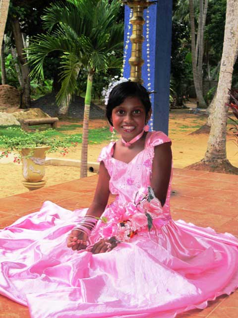 Selbst in Sri Lanka hätte fast das Wetter noch Einfluss auf das Fest gehabt. Die momentan mehr oder weniger einsetzende Regenzeit lässt keine Beständigkeit zu. Vielmehr muss man kontinuierlich mit einem Gewitter einhergehend mit einem kräftigen Regenschauer rechnen. Am Samstag lag das Glück auf der Seite des Angels Homes. Strahlender Sonnenschein erleichterte den Kindern das Aufstehen und das Erledigen der letzten Aufgaben; mit viel Freude wurden selbst die Schaukeln mit einer bunten Blütenpracht dekoriert. Kurz vor Festbeginn gilt es für eine singhalesische Frau, sich selbst in Schale zu werfen. Keines der Mädchen sah noch so aus wie zuvor: alle trugen ihre besten Kleider, waren von Schmuck und Schminke bedeckt und wirkten alle wie bildhübsche junge Frauen.