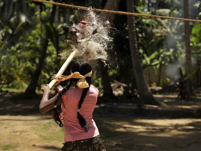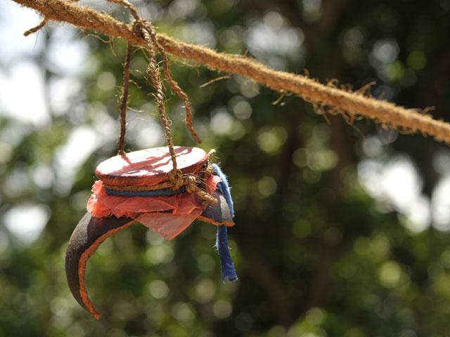 Großes Lachen und viel Freude erzeugte ein mir bisher unbekanntes Spiel. Mehrere Tonkrüge, mit unterschiedlichen Flüssigkeiten gefüllt, hingen an einem, zwischen zwei Palmen gespanntem Seil, ungefähr auf Augenhöhe herab. Mit verbundenen Augen, einem Stock in der Hand sowie eine durch voriges Drehen entstandene Orientierungslosigkeit hatte man die Aufgabe, sich gefühlsmäßig möglichst nah den Tonkrügen zu nähern. Ziel war es, dort einen der Tonkrüge kaputt zu hauen. Auf der einen Seite stand die teilweise völlige Ahnungslosigkeit und Orientierungslosigkeit der blinden Spielerin und auf der anderen Seite die Gespanntheit und Aufregung der anfeuernden Zuschauern, falls sich die Spielerin gekonnt den Krügen näherte. Beide Anlässe sorgten für eine überragende Stimmung und erzielten große Begeisterung bei den Festteilnehmern. Ich selbst lernte beim Erproben meiner Orientierung und Zielgenauigkeit die Schwierigkeit dieses Spiels kennen. Ich entwickelte großen Respekt davor, dass die Tonkrüge nicht nur korrekt und zielstrebend anvisiert, sondern zwei Mal sogar getroffen wurden. Bei aller Aufregung sprang dabei dann auch noch eine Kröte aus dem zerbrochenen Krug. Ich habe das, ohne nachzufragen, einfach mal als traditionelle Überraschung angesehen…