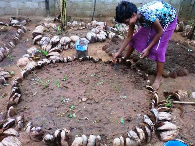 Zudem formen die Mädchen aus den Schalen nicht nur langweilige eckige Beetbegrenzungen, sondern es gibt neben runden und eckigen auch stern- und mondförmige und viele andere kreative Muster.