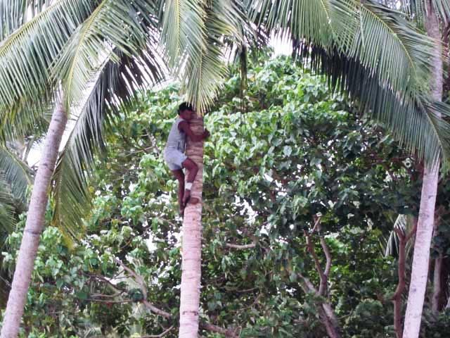 Vor circa 2 Wochen waren viele der Kokosnüsse auf den Palmen reif und nach und nach viel immer mal wieder eine auf den Boden. Das hört sich erstmal harmlos an, ist es aber nicht. Bekommt man nämlich so eine Nuss auf den Kopf, so kann das ganz schön schlimme Folgen haben. Aber die Kokoskusspflücker sind zum Glück, wenn auch mit ein bisschen Verspätung gekommen und haben die reifen Nüsse heruntergeholt. Dabei klettern die Männer ohne jede Hilfsmittel, geschweige den Sicherungsmaßnahmen, allein mit einem Band aus Kokosnussfasern zwischen den Füßen, auf die 20 Meter hohen Palmen.