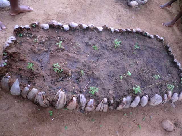 Die Bete sind in jedem Abschnitt sehr liebevoll gestaltet, vereinzelte Steine aber vor allem Kokosnussschalen trennen die einzelnen Bete voneinander, diese werden so mehr oder weniger recycelt und es muss kein Geld für viele Steine ausgegeben werden, ganz davon abgesehen, sehen die Schalen auch sehr dekorativ aus.