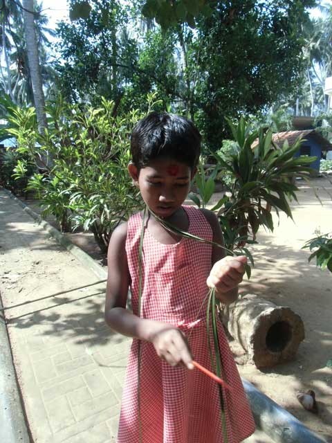 Besonders gerne schmücken sich die Mädels mit allerlei Dingen aus der Natur. Fast jeden Tag erfüllen sich die Jüngeren den Traum langer Haare, indem sie sich in dünne Streifen gerissene Palmblätter am Kopf befestigen und ihre neue Mähne stolz hinter sich herfliegen lassen. Mal wird die neue Haarpracht offen getragen, mal zu langen Zöpfen geflochten. Aus diesen Streifen werden aber nicht nur Haare: Auch als Arm-, Hals- und Beinschmuck machen sie sich gut.