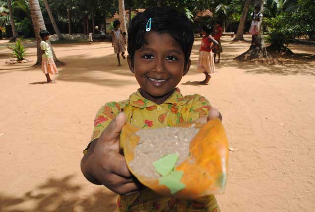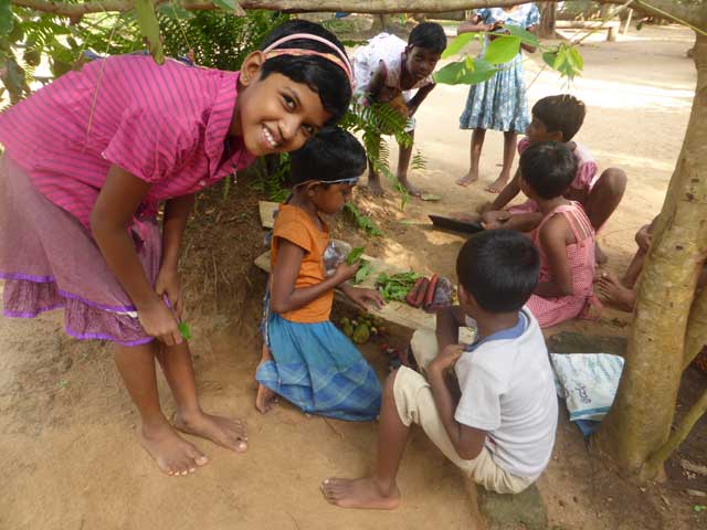 Auf der Karte in den Restaurants stehen unter anderem Reis (feiner Sand), Cola (Wasser), Necto (eine in Sri Lanka beliebte pinke und sehr süße Himbeerbrause, die von den Mädels perfekt aus roten Blüten und Wasser angerührt wird) und Schokotorte (hübsch angerichtete Matschkuchen).