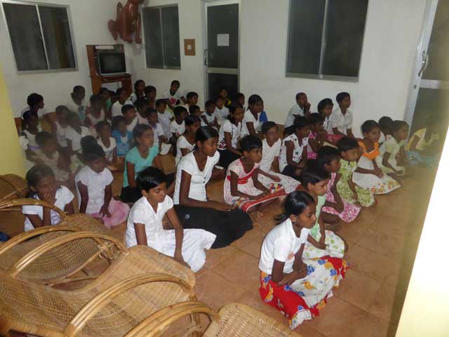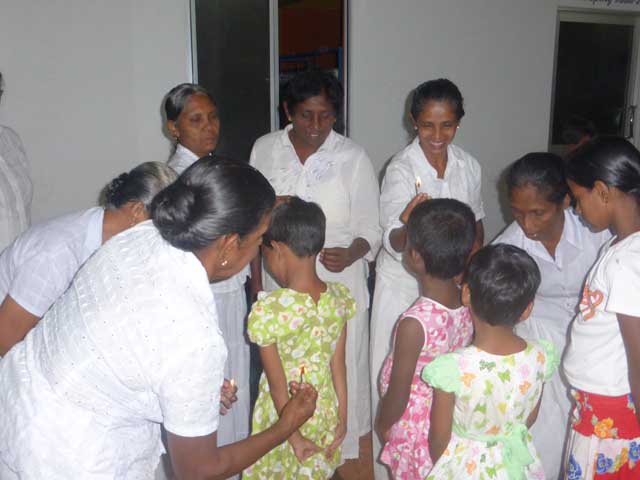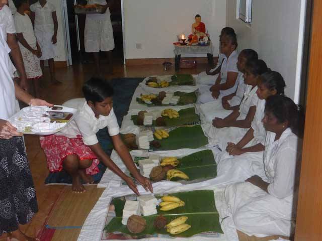 Und nun war es auch schon so weit. Aufstehen, Waschen, Zähneputzen und auf zum buddhistischen Altar. 7 Frauen in weißer Kleidung betreten den Raum. Nachdem vor jeder Frau ihr Festmahl auf Palmblättern serviert wurde, wird zuerst einmal gebetet. Für mich hört sich es eher wie ein Gemurmel der 7 Frauen an, jedoch können unsere buddhistischen Kinder alle in das Gemurmel mit Einstimmen.