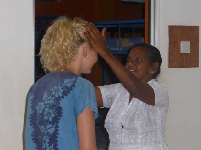 Nun die Segnung: Die erste Frau leuchtet jedes Kind von oben bis unten mit einer Kerze ab, die Frauen danach streichen mit Kokosöl über die Haare. Nachdem alle Kinder gesegnet wurden, waren unsere Erzieherinnen und zur Überraschung auch wir an der Reihe.