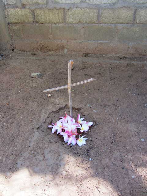 Und so marschierte ich, gefolgt von einer anschaulichen Gruppe Mädels, Samantha, der große Rauchschwaden mit sich zog, hinterher. Ziemlich amüsiert über diese Prozession hörte ich von den Mädels nur "pau, pau, pau" was so viel bedeutet wie sehr traurig und arm. Angekommen an Norberts letzter Ruhestätte schnappte sich eine unserer Mädchen gekonnt die Hacke und hob noch schnell ein Grab aus, welches mit Blättern ausgelegt wurde. Hier ruht nun unser ehemaliger Mitbewohner und wenn ich bei der Gartenarbeit manchmal vorbeikomme an seinem Grab, dass Dank des selbstgebastelten Kreuzes gut erkennbar ist, dann muss ich wieder einmal sagen: "Hier in Sri Lanka – ja da erlebt man schon was".