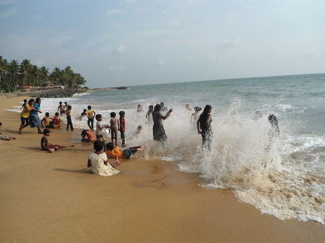 Bei den tropischen Temperaturen durfte natürlich auch ein Strandbesuch nicht fehlen. Doch zu unserer Überraschung können weder die Mädchen, noch die meisten Erwachsenen in Sri Lanka schwimmen. Was aber nicht heißt, dass wir keinen Spaß am Baden im Meer hatten. Ganz im Gegenteil, in voller Montur standen wir im flachen Wasser und tollten mit unseren Mädels herum, stets immer ein Auge darauf, dass niemand zu weit nach draußen paddelte.