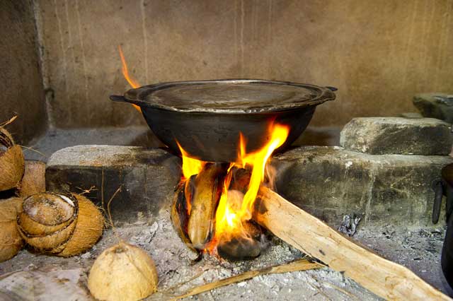 Nach dieser ganzen Wascherei grummelt verständlicherweise der Magen: gekocht wird auf einer Feuerstelle mit Brennholz und Kokosschalen, der Tee köchelt auf einem kleinen Gasherd vor sich hin.