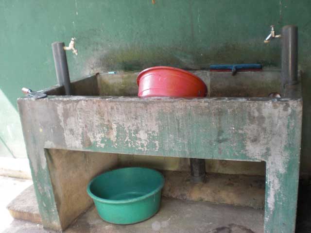 Da die eingebauten Duschen nur in der Regenzeit genutzt werden, wäscht man sich hier ganz old school an einem großen Wasserbassin – und das in der Gruppe.