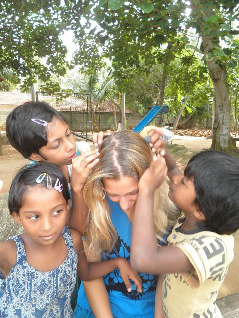Wenn es bis hierhin nur eine Ahnung sowie ein leichter Juckreiz am Kopf war, nun hatte ich es schwarz auf weiß beziehungsweise Laus auf Hand. Ein sehr beliebte Beschäftigung der Mädels ist es, den Praktikantinnen die Haare zu flechten, nach dem Motto: Du hast die Haare schön ...lalala... und bei eben dieser Beschäftigung wurde heute ein leises Murmeln um mich „Tatis??" (singhalesisch für Laus) zu einem immer lauteren „Taaatiiis!!" und schon wurde mir triumphierend meine erste Laus auf die Hand gelegt. Zum Glück sind die Mädchen geübt in Entlausungskuren und so wurde ein gutes Stück Unkraut mit leichtem Ziehen, Drücken und Zupfen sofort gejätet. Der Sonntag, war der Tag vor der Abreise für ungefähr der Hälfte der Mädchen, die die Ferien „zu Hause" verbringen durften oder anders gesagt, bei denen überhaupt noch ein zu Hause existiert, das in der Lage ist, die Mädels zu versorgen. So wurde den ganzen Tag aufgeregt erzählt, wer denn alles heimfährt. Als die kleine Subani merkte, dass sie wohl nicht zu den glücklichen Heimfahrern zählt, sondern die Ferien hier im Angelshome verbringt, wurde sie plötzlich ganz traurig, setzte sich auf einen Stuhl und vergrub das Gesicht in ihren Händen. Wie sie da so saß, wünschte ich, sie könnte sich kurz durch meine Augen sehen und erkennen, wie schön, wie taff, lustig und redegewandt sie ist. Und erstmals hatte ich das Gefühl, ansatzweise zu verstehen, wie es ist keine Familie mehr zu haben oder andersherum wie wertvoll eine liebende Familie ist, denn diese kann nicht einmal das beste Kinderheim der Welt ersetzen.