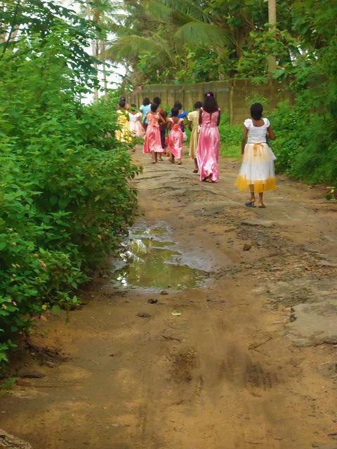 Als ich, nach getaner Arbeit, zu den Kleiderschränken der Mädchen komme, erwartet mich dort ein riesiger, glitzernder und schimmernder Kleiderhaufen, der von unseren kleinen und großen Girls begutachtet wird. Noch bevor ich nachfragen kann bemerkt Premalattha meinen Blick und beantwortet mit einem knappen „for church“ meine Fragen. Doch die nächste drängende Frage folgt sogleich: Soll ich so etwas etwa auch tragen, wenn ich sie in die Kirche begleite? Obwohl die kleinen Mädchen die Kleidchen mit leuchtenden Augen betrachten, so bleiben die Großen und ich doch skeptisch. Denn mit den Kleidchen aus Satin, die über und über mit Steckblumen und Glitter verziert sind, gleichen auch unsere Mädchen den alljährlichen Faschingsprinzessinnen in Deutschland.