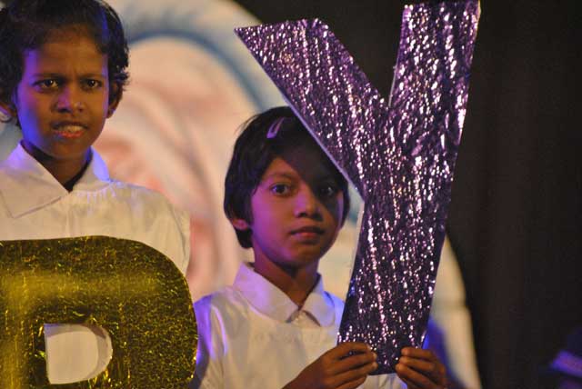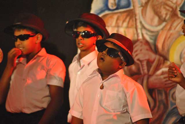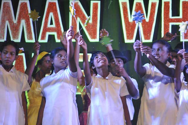 Besondere Freude machten uns natürlich die Auftritte von Kumari Tharushika und Achini. Mal alle zusammen auf der Bühne oder zwischen anderen Schülern der Schule sieht man auch ihnen die Freude an, während sie silbern goldene Sterne in die Höhe halten.