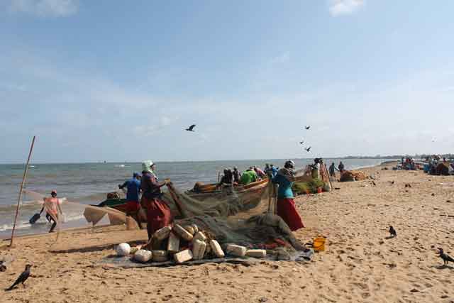 Gegen 8 Uhr erreichte ich die Bus Station Negombos. Die Stadt, welche zu einem der wichtigsten Fischereihäfen an der Westküste des Landes zählt, ist vor allem für ihren täglichen Fischmarkt bekannt. Jeden Morgen bis 11 Uhr werden die Fänge jeglicher Art in der Nähe des Strandes verkauft. Nachdem ich mich erfolgreich bis zum Markt durchgefragt hatte, ließ mich der stark fischige Geruch anfangs an meine Grenzen stoßen, sodass ich mich zunächst an die frische Luft am Wasser flüchtete. Dunkle Planen schienen sich über den ganzen Strand hinweg zu erstrecken. Auf ihnen ruhen die Fänge, welche später als „DriedFish“ verkauft werden. Gesamte Familien arbeiten gemeinsam an dem Einholen der Boote und dem Entleeren der Netze.