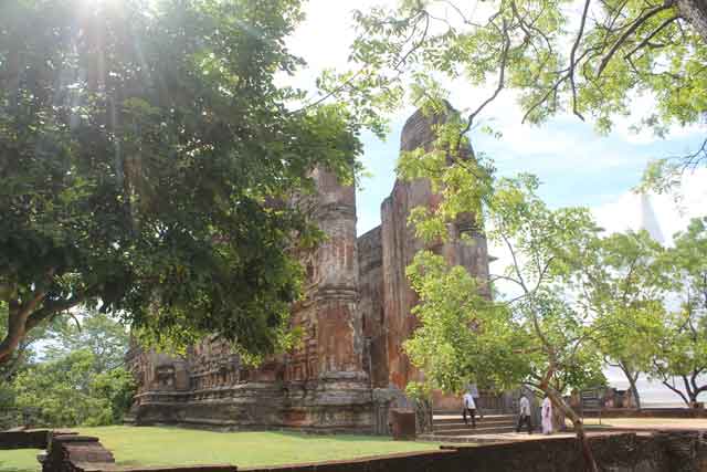 Die Ursprünge der zweiten Königsstadt liegen bereits in vorchristlicher Zeit. Polonnaruwa ist daher vor allem für seine alten und äußerst gut erhaltenen Ruinen aus diesem Zeitalter bekannt. Da es seit dem Jahre 1982 zum UNESCO Weltkulturerbe zählt, ist es besonders für Touristen ein Anziehungspunkt geworden. Mit den Fahrrädern konnten wir die Straße passieren, welche durch das Gelände der Ruinen führt. Da unsere Zeit in Polonnaruwa eher begrenzt war, gestaltete es sich durchaus angenehm, den Weg auf diese Weise zurückzulegen. Bei den einzelnen Bauten hielten wir an, um uns die alten Ruinen – natürlich barfuß – aus nächster Nähe anzuschauen.![]()