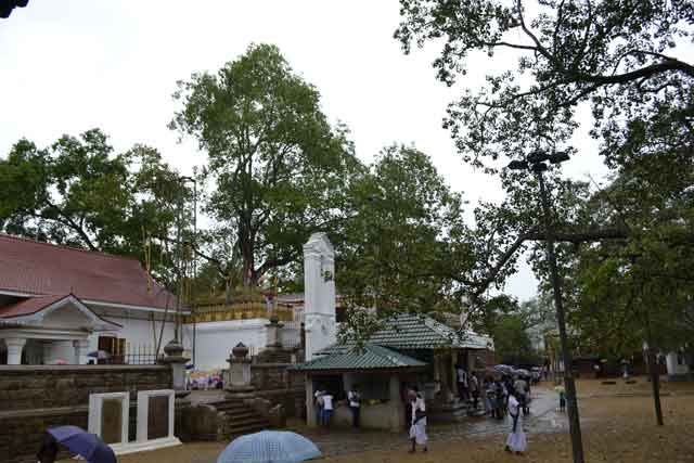 In Anuwadhapura angekommen schnappten wir uns ein Tuktuk, das uns zu den heiligen Stätten brachte. Zuerst besichtigten wir den über 2000 Jahre alten heiligen Bodhibaum, den „Bruder“ des Bodhibaums in Indien unter dem Buddha seine Erleuchtung fand. Der Baum wird wirklich wie ein Heiliger behandelt: seine Äste werden von goldenen Stützen getragen, jeden Tag beten hunderte Buddhisten zu ihm und opfern Blumengestecke (auch wenn diese meist von den dort herumtollenden Affen gegessen werden) und auf dem Gelände um ihn herum sind im Laufe der Jahre viele weitere, kleine Sehenswürdigkeiten entstanden. Da wir am Abend bereits in Sigiriya sein wollten und unsere Zeit daher begrenzt war, kauften wir nicht das völlig überteuerte Sightseeing-Ticket mit dem man alle Heiligtümer besichtigen könnten, und beschränkten uns auf die wenigen kostenlosen, aber nicht minder interessanten Sehenswürdigkeiten. Nach einer großen weißen Dagoba, einer massiven Kuppel aus weißangemalten Backsteinen, in deren Mitte angeblich der tamilische König Elara ruht, schauten wir uns noch einen kleinen Tempel an, der in einen Felsen gehauen war.