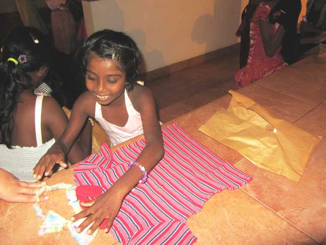 Ursprünglich sollten Julia und ich in dieser Zeit im Heim bleiben, da es hier in Sri Lanka, einem Land welches nach dem Tsunami mit Hilfen nahezu überhäuft wurde, von denen bei den wirklich Armen jedoch meist nur wenig ankam, leider oft einen komischen Beigeschmack hat wenn „Sudus“, also Weiße, Spenden verteilen. Da es bei über 40 Paketen aber am einfachsten war, diese mit dem Van zu transportieren, der glücklicherweise verdunkelte Rückscheiben hat, konnten wir Praktikantinnen zusammen mit Julia mitfahren und das Geschehen von der Rückbank aus beobachten. Eigentlich fand ich es schade, dass wir uns so „verstecken“ mussten, aber somit konnten wir wenigstens die Reaktionen der Anwohner mitbekommen. Nicht nur die Kinder, die die Geschenke bekamen, sondern auch unsere Mädels strahlten von einem Ohr zum anderen. Auch für sie, die sonst selbst Spenden empfangen, war diese Erfahrung des Gebens neu und alle hatten großen Spaß daran. Manche Mütter und Großmütter hatten sogar Tränen in den Augen als wir bei ihnen vor der Tür standen und auch bei uns dreien auf der Rückbank wurden die Augen bei diesem rührenden und herzwärmenden Anblick feucht. Wir waren uns einig: diese Erfahrung war das beste Weihnachtsgeschenk ever. Ich hatte das Gefühl etwas wirklich Sinnvolles getan zu haben und bin wirklich dankbar dafür das erlebt haben zu dürfen.