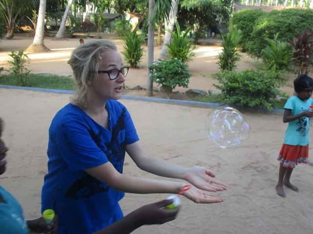 Die Organisation hier ist eigentlich ziemlich gut und trotzdem stehe ich manchmal einfach im Raum und weiß nicht was los ist oder was ich tun soll. Wenn ich das Personal frage, auch hier sprechen einige gar kein Englisch, bekomme ich zwar ein nettes lächeln und eine Tasse Tee in die Hand gedrückt, obwohl ich grade drauf und dran war in der Küche zu helfen. Jedoch muss ich hier einsehen, was viele der älteren Mädchen natürlich mehr Plan haben als ich und ich in die Aufgabenbereiche erst reinwachsen muss. Dann geh ich wieder zum Spielen und Kuscheln zurück und turne auf dem neuen tollen Spielplatz oder lass mir von den Kinder die Bananenpflanzen, Blumen, Kokosnüsse und allerlei kleine Freuden zeigen, die dieser wunderbare Platz so mit sich bringt. Bei der Lernzeit, schlage ich mir die Hände über den Kopf zusammen und würde manchmal gerne das singalesische Alphabet beibringen, aber auch hier bin ich keine Hilfe. Jedenfalls Englisch kann ich ein bisschen vermitteln und das erfordert eine große Portion Geduld, aber es macht auch Spaß, wenn sich Erfolge einstellen. Auch hier sei zu sagen, dass dies nicht auf alle Mädchen zutrifft. Oft bin ich dankbar für die älteren Mädchen, die mir übersetzen, erklären und ich danach wieder mehr einen Durchblick habe.