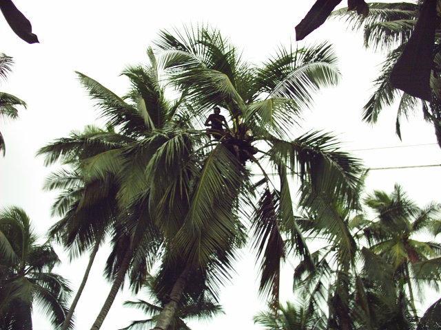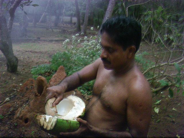Heute habe ich ihn endlich erwischt, den Kokosnusspflücker. Sie bewegen sich oft so schnell von Palme zu Palme, dass man sie nur hört. Aber ich habe ihm heute auf Singha zugerufen , dass er doch mal etwas langsamer laufen sollte . Ob er mich verstanden hat , weiß ich nicht, aber er blieb auf der nächsten Palme stehen und fragte mich, ob ich eine Kokosnuss haben möchte. Ich rief ihm zu, dass ich gerne eine hätte. Kaum ausgesprochen, warf er aus der Höhe und Entfernung eine Nuss fast vor meine Füße. Ich habe mich doch ein wenig erschrocken, denn sie wiegen so ca. 2 kg und wenn man sie an den Kopf bekommt, kann man sich das Arrack trinken sparen. Als ich sie aufhob, kam auch schon die nächste angeflogen und landete an der selben Stelle! Mein Freund Kingslee sagte nur, dass ich keine Angst haben müsse, sie würden aus der Entfernung sogar einen Elefanten treffen ( Lach) . So eine Nuss direkt vom Baum ist schon was Feines, vor allem gut gegen den Durst.