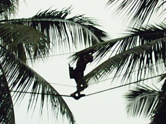 Heute habe ich versucht , mal auf eine Palme zu klettern. Nach ca. 5 Metern war es mir doch nicht ganz geheuer, denn bis in die Spitze waren es noch 10 Meter . Hier werden von Palme zu Palme zwei Seile gespannt, worüber sich die Pflücker bewegen. Beim bloßen Anblick ist mir schon schwindelig geworden....