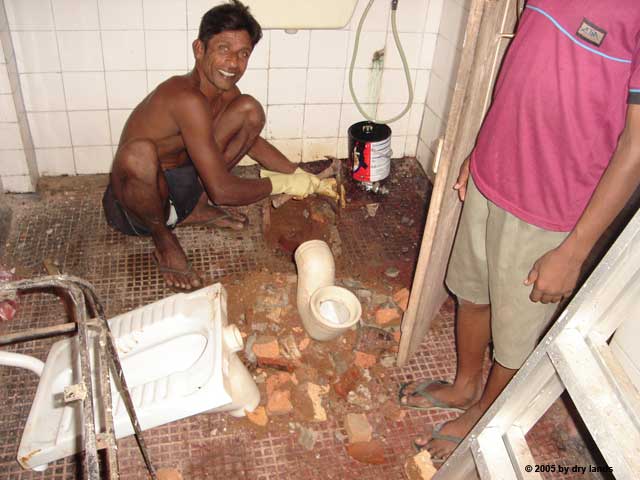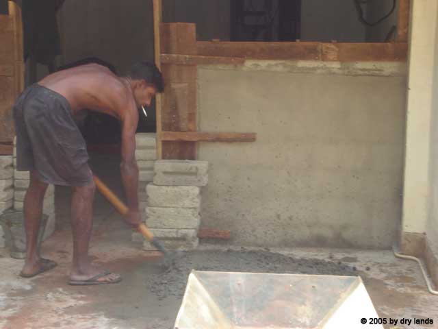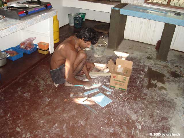 Mit Lexmann hoffe ich, so jemanden gefunden zu haben. Er ist ein Alleskönner und hat sogar Spaß an der Arbeit . Von der Gartenarbeit über Elektrik bis hin zu Holz - und Steinarbeiten, beherrscht er wirklich alles. Er bekommt 8000 Rs im Monat, das sind ca. 66 €. Hier seht ihr Lexmann gerade beim Fliesenlegen.