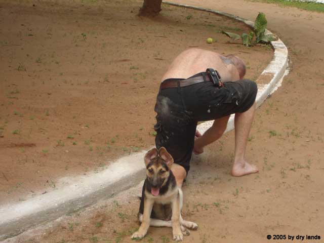 Von Lexman, dem Handwerker gibt es weniger Neues zu berichten. Nur eben, dass er wie immer äußerst fleißig zuwerke geht und alles in unglaublicher Geschwindigkeit abwickelt. Wie Flash Gordon in langsam. Und Buddy ist aktiver als sonst. Das einzige Problem ist, dass er mit sich allen beschäftigt ist und wir kaum die Zeit aufbringen können, mal richtig mit ihm zu spielen. Er hat momentan nur die Aufgabe des Wachhundes , und die nimmt er sehr ernst, wenn er sich nicht gerade an den Anti-Mücken Utensilien beflügelt.