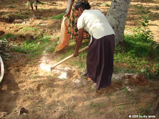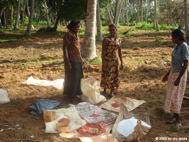 Die anderen Anwesenden waren hauptsächlich Frauen und ältere Jungen, die die Arbeit erledigten. Vorort glaube ich unter 25 Menschen vier Männer gesehen zu haben. Jedoch scheuten sich die Frauen und die Kinder nicht , die schwere Arbeit zu verrichten. Auch dass es mehrere Hektar zu bearbeiten galt, störte sie nicht. Ihre Arbeit bestand hauptsächlich darin, die Erde um die Palmen herum aufzuwühlen und ein weiß-rötliches Pulver hineinzumischen. Dieses Pulver bringt die Kokosnüsse zum Runterfallen