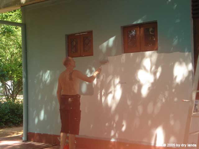 Im Moment sind wir beim Badezimmer, wir haben einen Teil der Dachkonstruktion ausgewechselt, da sie von Termiten befallen waren. Die Zwischendecke ist auch schon drin und das neue WC ist auch angeschlossen. Fehlt nur noch der Anstrich, und der wird heute noch fertig.