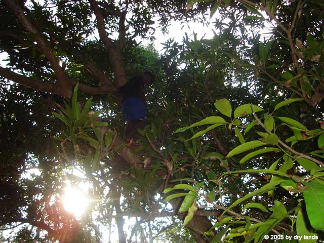 Wir warten schon seit Tagen darauf, dass wir endlich mal ein paar reife Mangos ernten können. Aber immer, wenn wir in den Baum klettern wollen, um sie runterzuholen, sind sie verschwunden. Ich saß gerade am PC, als Budy anfing zu bellen, wir gingen raus, und er lief sofort auf den Mangobaum zu. In einiger Entfernung standen am Zaun ein paar winkende Mädchen. Ich ging zu ihnen rüber.... aber Budy blieb am Baum stehen und bellte die ganze Zeit. Als ich oben in die Spitze des Baumes sah, erblickte ich 2 Jungs, die fröhlich am Mangopflücken waren. Als ich auf sie zuging, schienen sie doch ein wenig verängstigt zu sein, da ich sie ja erwischt hatte ..sie bewegten sich keinen Zentimeter von der Stelle. Ich fragte sie, ob sie Englisch sprechen, aber sie schüttelten nur mit dem Kopf. Ich sagte ihnen auf Singhalesisch, dass sie vom Baum runterkommen sollten, aber das wollten sie nicht. Sie hatten wohl ein wenig Angst vor dem großen, weißen Mann, der auch noch singhalesisch spricht! In der Zwischenzeit kamen die Mädchen auch näher, eine von ihnen sprach sogar ganz gut Englisch. Ich sagte ihr, dass wir einen Deal machen könnten.... die Hälfte der Mangos würden sie bekommen , wenn sie mir bei der anderen Hälfte beim Pflücken helfen. Das Mädchen übersetzte und dann fing ein lautes Gekreische an. Sie freuten sich und fingen sofort an, die Mangos den Mädchen zuzuwerfen. War schon ganz interessant, den Jungs beim Klettern zuzusehen. Von vorsichtigem Klettern kann hier nicht gesprochen werden, eher wie es die Affen machen! Nach 15 Minuten kamen sie runter und meinten mit einem Grinsen im Gesicht, dass ich doch noch zwei Bäume im Garten hätte und ob der Deal auch dafür gelten würde. Ganz schön frech, die Kleinen........ ich sagte ihm: Jande, jande, (Besser, du gehst jetzt) und das nächste Mal sagt ihr Bescheid! Das hat er verstanden und mit einem breitem Grinsen verließ die Rasselbande das Grundstück.