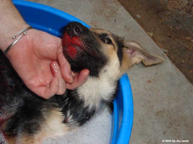 What about Budy ? Na, dem ist langweilig. .....da beschloss er, mir beim Streichen zu helfen. Und ich habe noch gesagt: " Zieh dir Handschuhe an! " Aber nein - er wollte ja nicht hören (Grins) und das hat er nun davon, denn auf Baden steht er überhaupt nicht ! Irgendwie sah er aus, als wäre er in einen Schminkkoffer gefallen und dort hat er mit dem Lippenstift gekämpft!