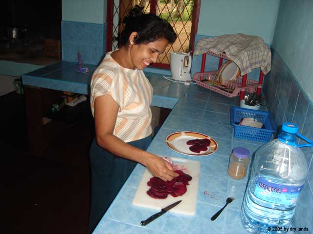 Latta , unsere Hausdame ist immer gut drauf, sie igrinst den ganzen Tag und wenn sie putzt, denkt man, Meister Proper wirbelt durch die Räume. ....aber wenn mir nicht langsam was einfällt , wie ich ihr das Kochen beibringe, werde ich wohl die Eröffnung nicht mehr erleben, denn bis dahin sind wir verhungert! Auf dem Foto unten seht ihr ein Abendessen für 2 Personen. Ne.... da kommt nicht noch mehr, das ist alles! ..Rote Bete in Chili . ...Als Nikon das sah meinte er : "Ich fahre mal schnell in die nächste Pommesbude und hole was!" Nach 2,5 Stunden kam er wieder und was er in seinem Beutel hatte, hätte nicht mal für einen gereicht. Also, doch wieder selber kochen ????