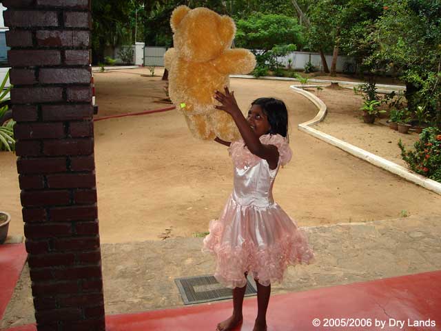 Am Dienstag, dem 06.06. , hatten wir ein Geburtstagskind ! Chanchala wurde 9 Jahre alt. Leider ging an diesem Tag fast alles schief. Erst habe ich verschlafen, dann bin ich hektisch losgefahren um den Geburtstagskuchen abzuholen und hätte dabei fast einen Bus , der mir auf meiner Fahrbahn entgegenkam, übersehen. "Ja ne, iss klar !" Wie kann man einen Bus übersehen? Hier geht das! Nur den Bruchteil einer Sekunde woanders hingeschaut und Schluss mit lustig. Als ich dann etwas zittrig zur Bäckerei kam, war der Geburtstagskuchen nicht da. Hatte man doch glatt vergessen! Und aus dem weißen Teddy, den sie sich gewünscht hat, wurde ein goldiger ????Dann hatte ich ihr versprochen, dass wir zum Meer gehen. Unglaublich ! Sie wohnte vorher nur 2 km vom Meer entfernt und war noch nie dort. Also gingen wir mit Budy runter zum Meer.... ich glaube, darüber hat sie sich mehr gefreut als über den Teddy! Naja, war ja auch kein weißer????Als wir am Strand standen, sagte ich ihr noch, dass sie aufpassen soll, da die Wellen zur Zeit sehr hoch sind und die Strömung sehr stark ist. Ihr kennt ja das Spielchen, wenn das Wasser wieder zurück geht . Dann macht man noch ein paar Schritte nach vorne, und das macht man so lange, bis das Wasser einen erreicht. Jedesmal , wenn eine große Welle kam, habe ich ihr gesagt, dass sie zurückkommen soll. Das Wasser erreichte aber nie ihre Füße. Die nächste Welle war eine ganz kleine, die es aber in sich hatte. Ruck - Zuck lag sie lang im Wasser. Ich habe mich so erschrocken, dass ich die Kamera fallen gelassen habe, um sie aus dem Wasser zu holen. Als ich sie hatte, kam die nächste Welle und nun lagen wir beide im Wasser. Chanchala konnte sich vor Lachen nicht halten. Ich musste zwar auch lachen, fand es aber an diesem Tag gar nicht so lustig. Hätte auch Freitag, der 13. sein können. Aber zum Glück ist nichts passiert. In der Zwischenzeit wollte Latta Reiskuchen machen, da es ja keinen Kuchen gab. Fertig wurde der allerdings auch nicht, da die beiden Hunde ihn aus der Küche gemopst haben.... Alles in allem war es ein richtig netter Tag.