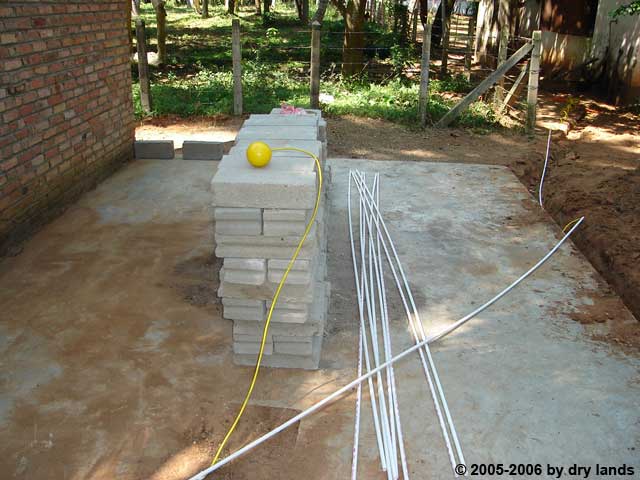 Nach einer kurzen Begrüßung wollte die Dame von der Aufsicht sofort das Haus ansehen. Ich war gar nicht darauf vorbereitet und kurz zuvor noch am Streichen gewesen. Sie fragte als erstes nach der Küche, als wir sie betraten, stürzte sie förmlich auf das Regal mit den Tassen und sagte sofort, die könnten wir nicht nehmen, es müssten Plastikbecher sein! Ich habe nur noch gedacht, das kann ja heiter werden, wenn sie schon als erstes die Tassen beanstandet! Das nächste, was sie sehen wollte, war die Außentoilette, die aber noch nicht fertig war. Ich erklärte ihr, dass es in den letzten Tagen viel geregnet hat und wir erst einmal Innen weiter gearbeitet haben. Als nächstes fragte sie nach dem Wasserbrunnen, da konnte ich ihr aber einen Wasserturm vom Feinsten zeigen... Grins. Als sie ihn sah, wurden ihre Gesichtzüge etwas freundlicher .