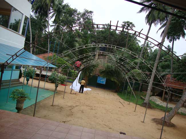 Jetzt gerade fangen die Vorbereitungen für die Show an. Da wir in den letzten Wochen fast täglich heftigen Monsunregen hatten, sind wir nun dabei, Regenzelte aufzubauen. Da es im Moment auch noch recht windig ist, wurden heute morgen auch noch die Kokosnüsse geerntet und die Palmen von alten Blättern gesäubert.