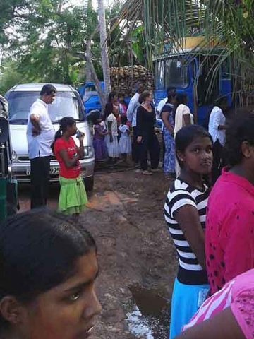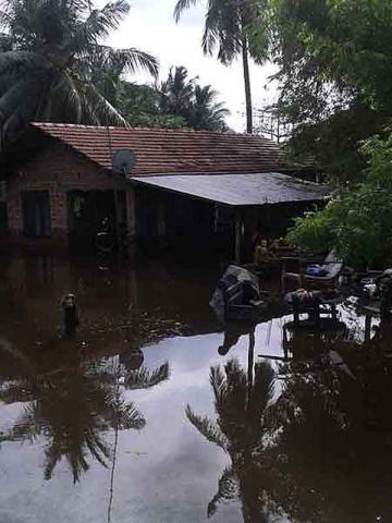 Mit den ersten 50 Hilfspaketen machten wir uns in 2 Gruppen auf den Weg, um ca. 200 Flutopfer mit dem Nötigsten zu unterstützen. Bereits wenige Kilometer von Marawila entfernt, im Nachbarort Nattandiya, sahen wir die ersten schlimmen Überflutungen. Ganze Straßen und Häuser stehen komplett unter Wasser und auch unsere Mädchen waren sehr schockiert über die Zustände, in denen manche Menschen leben müssen.