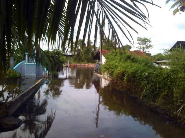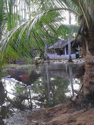 Besonders leid tat uns eine ca. 80-jährige Omi, die versuchte, sich durch Wasser, Schlamm und Kokosnüsse einen Weg zu ihrem überfluteten Haus zu bahnen. Seit Tagen schläft sie mit 3 anderen Familien im Freien auf einem Haufen gefüllter Säcke mit Kokosnussfasern.
