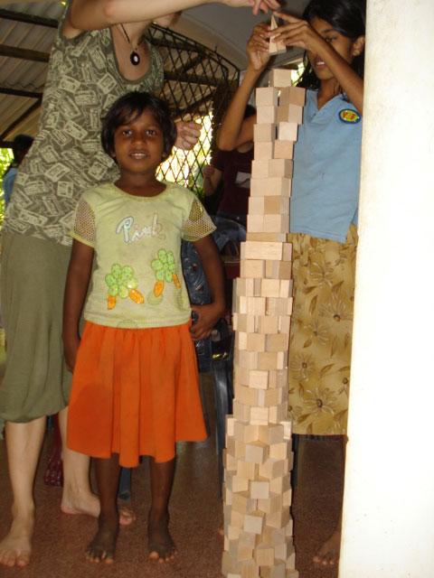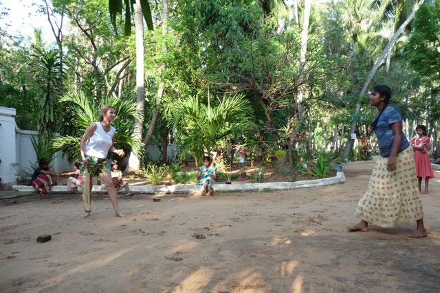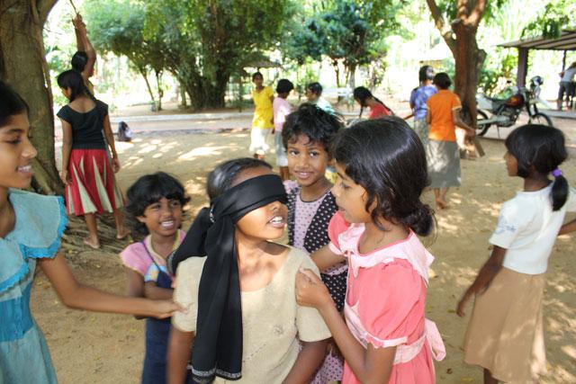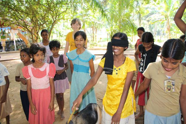 Neugierig auf jedes neue Spiel, hörten sich die Kids die Spielregeln an, die spätestens nach dem dritten Durchgang nichts mehr mit unseren Vorgaben zu tun hatten: die Durchgänge wurden immer schneller (jedes Kind wollte verständlicherweise möglichst schnell zu seinem Geschenk kommen) und die Anweisungen der Kinder an das jeweilige Kind mit den verbundenen Augen - auf singhalesisch natürlich - waren alles andere als ‚cold', ‚warm' oder ‚hot', sondern beschrieben offensichtlich ganz klar die Richtung und Entfernung, wo der Topf mit dem Geschenk stand. Und wenn das nicht half, wurde einfach der Arm des topfschlagenden Kindes ergriffen und in Richtung Topf geführt... Egal, alle hatten ihren Spass und haben sich gefreut. Das war ja auch die Hauptsache!