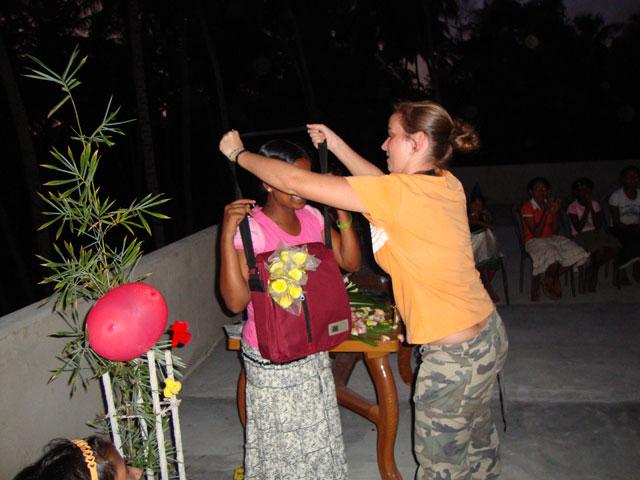 Zum 18. Geburtstag haben wir auch bezüglich des Nicht-Schenkens mal eine Ausnahme gemacht. Durch die Unterstützung von Udeshikas Patenmama konnten wir eine flotte Umhängetasche besorgen, in der allerhand nützliche Sachen verstaut waren. Beispielsweise ein Handtuch, verschiedene Kosmetikartikel und Haarschmuck. Udeshika hat sich riesig darüber gefreut!