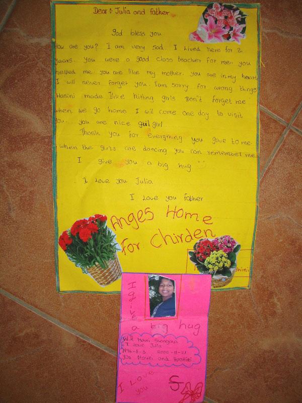 "Liebe Julia und lieber Vater, möge Gott euch schützen. Wie geht es euch? Ich bin sehr traurig, dass ich heute gehe, denn ich habe 2 Jahre hier gelebt. (Eigentlich waren es 3,5 Jahre, aber Kinder haben es wohl nicht so mit der Zeit.) Du warst immer eine gute Lehrerin für mich. Du hast mir geholfen und bist wie meine Mutter. Ihr werdet immer in meinem Herz sein und ich werde euch nie vergessen. Ich entschuldige mich für die Fehler, die Hasini manchmal gemacht hat, z.B. wenn sie die anderen Mädchen gehauen hat. Vergesst mich nicht! Jetzt wo wir nach Hause gehen, werde ich irgendwann einen Tag zu euch zu Besuch kommen. Du bist ein nettes Mädchen. Vielen Dank für alles, was ihr mir gegeben habt. Wenn die anderen Mädchen tanzen, könnt ihr euch immer an mich erinnern. Ich gebe euch ein große Umarmung. Ich liebe dich, Julia. Ich liebe dich, Vater."