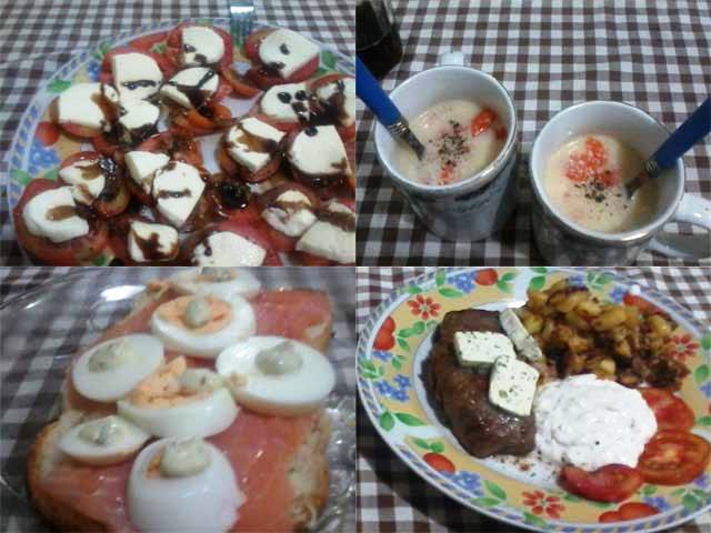 1. Gang: Tomate, Mozarella, Basilikum und Balsamico Cream 2. Gang: Möhren- / Eiersuppe 3. Gang: Weißbrot mit Lachs und Ei 4. Gang: Rindersteak mit Pellkartoffeln und Kräuterquark 5. Gang: Paradies-Creme Sahne-Karamell