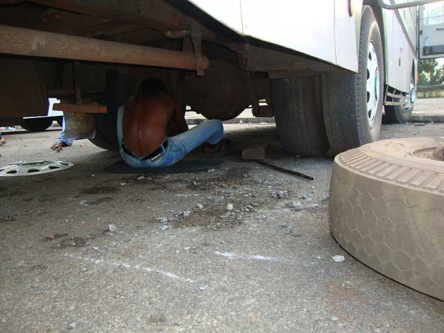 Julia: Unser erster Halt war in Alutgama, wo wir uns außerplanmäßig eine große Dagoba angeschaut haben. Außerplanmäßig deshalb, weil es kurz zuvor während der Fahrt einen lauten Knall gegeben hat und man mit einem kurzen prüfenden Blick feststellte, dass ein Reifen geplatzt war. Ich als Frau würde ja meinen, ein Reifelwechsel bei einem Bus ist kein Kinderspiel und man braucht dafür eine Werkstatt. Aber in Sri Lanka ist nun mal alles anders; da wird der Reifen eben schnell zu zweit innerhalb von 10 Minuten auf dem Parkplatz gewechselt. Die beiden Jungs haben das super hinbekommen und auch später konnten sie nochmal beweisen, dass sie für jedes Problem eine Lösung parat haben.