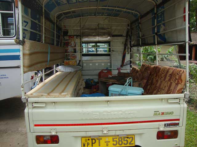 weiter zu einem bekannten buddhistischen Tempel namens "Kandewihare", wo die Mädels und das Personal gebetet haben und Frank und ich uns auf dem Parkplatz von einem alten Einheimischen anstarren lassen haben. Außerdem entdeckten wir bei dieser kurzen Ruhepause die singhalesische Variante eines Party-Fahrzeugs. Ein paar alte Polster und die Picknickbox bis zum Rand vollgepackt - damit wird auch die älteste Ladefläche zur Partymeile. Alles in allem hatten wir wieder einen Tag voller schöner und verrückter Erlebnisse. Normal verreisen kann ja jeder...
