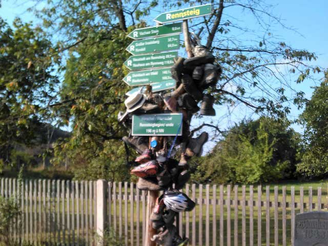 Natürlich war es nicht möglich, in den 4 Tagen den kompletten Rennsteig zu bewandern, aber wir gaben unser Bestes und schafften bis Donnerstag 74 km vom Wanderweg, wobei wir insgesamt sogar 86 km gewandert sind. (Die Differenz ergab sich aufgrund kleiner Desorientierungen, die das weibliche Geschlecht wohl manchmal so mit sich bringt.) Unser Endziel für dieses Mal war die sogenannte „Schmücke“, das höchst gelegene Bergplateau des Thüringer Waldes. Mit geschwollenen Füßen und schmerzenden Knien ging es schließlich von Oberhof mit dem Zug wieder zurück nach Meiningen. Im Gepäck natürlich den Stein vom Startpunkt, den wir nun aufheben, bis wir die Wanderung am Rennsteig irgendwann fortsetzen und ihn nach altem Brauch am Endpunkt in die Saale werfen können. Mal sehen, wann das sein wird…